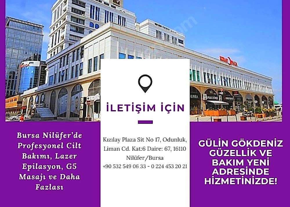 Güzelliğinize güzellik katmak ve kendinizi özel hissetmek istiyorsanız, Gülin Gökdeniz Güzellik ve Bakım artık yeni ve modern adresinde sizlerle. Hizmetlerimizi artık Kızılay Plaza Sit No 17, Odunluk, Liman Cd. Kat:6 Daire: 67, 16110 Nilüfer/Bursa adresinde sunuyoruz.